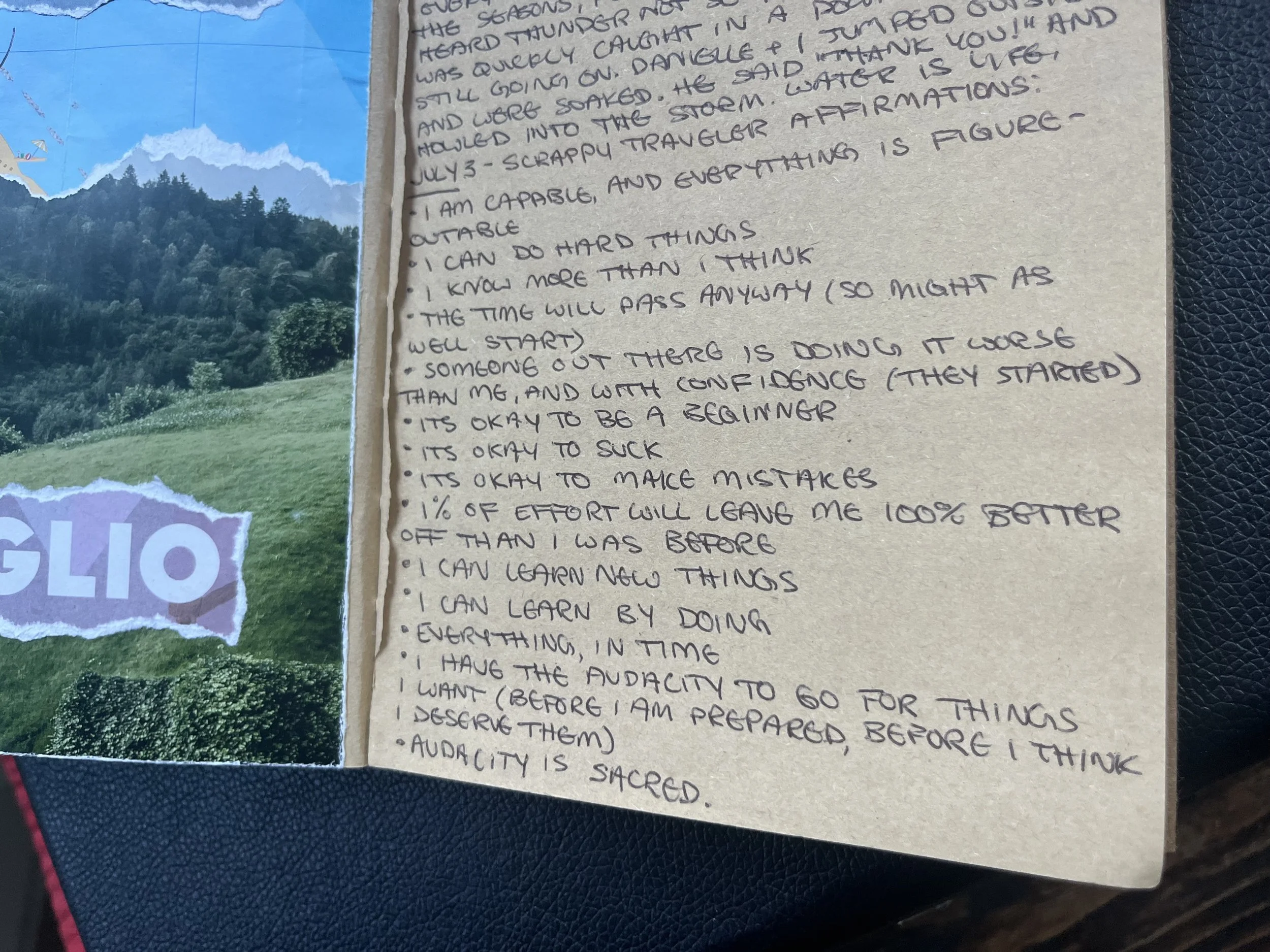 Over time, I racked up numerous affirmations and mantras that have helped me build confidence as an often-solo, female traveler. Some are statements that I once saw as little white lies, and now wholeheartedly believe (for example: “I am capable, and everything is figure-outable”). Others are gentler phrases that help ease me out of moments of exponential dread and black-and-white thinking (for example: “It’s okay to be a beginner” and “Everything, in time”).