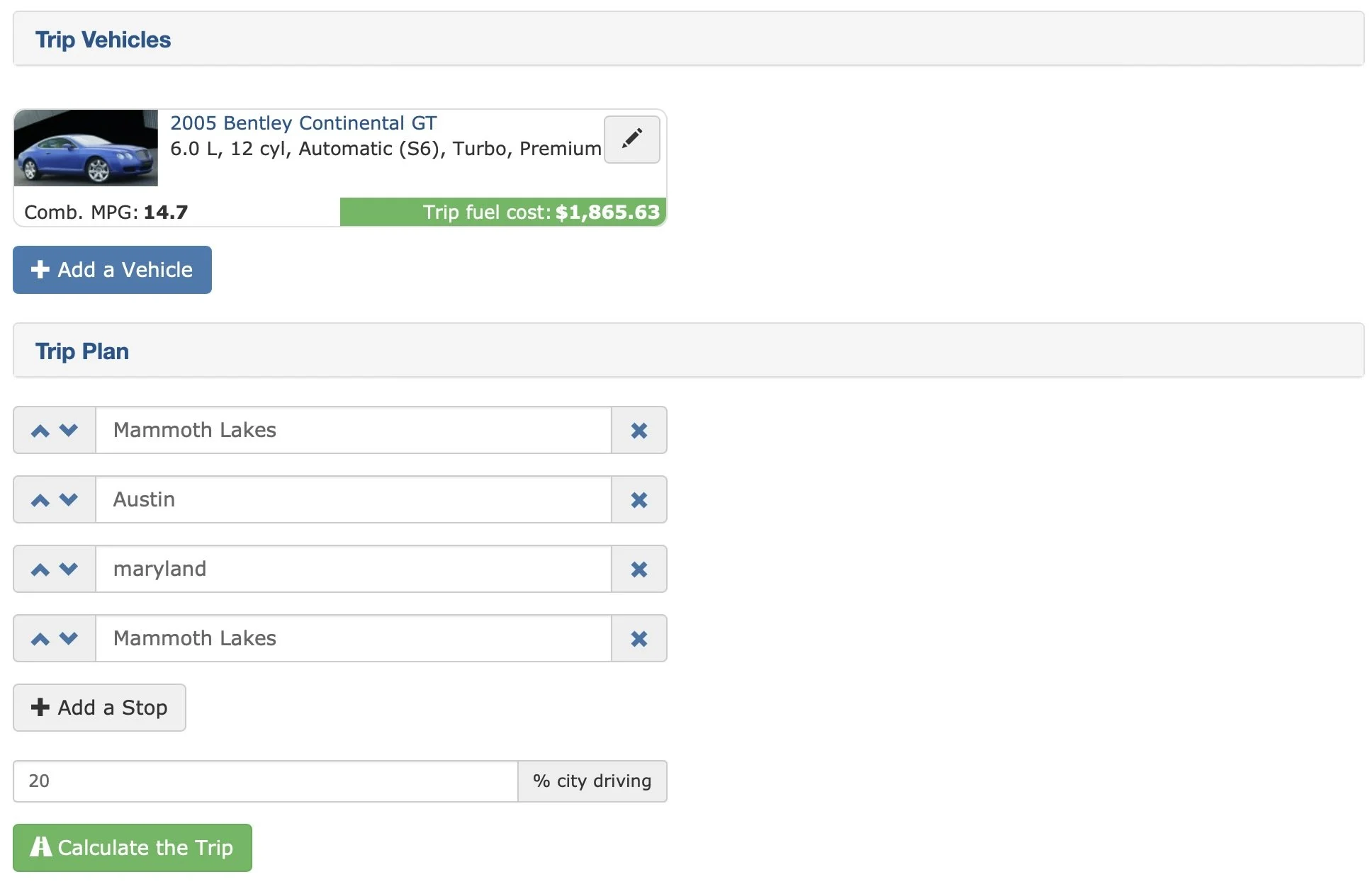 I returned to the Fuel Economy Calculator to see how many miles it said I would be driving on my trip- the answer was about 5,500 miles. 5,500 divided by 380 is 14.47, meaning I’d have to refill my tank approximately 14 times.