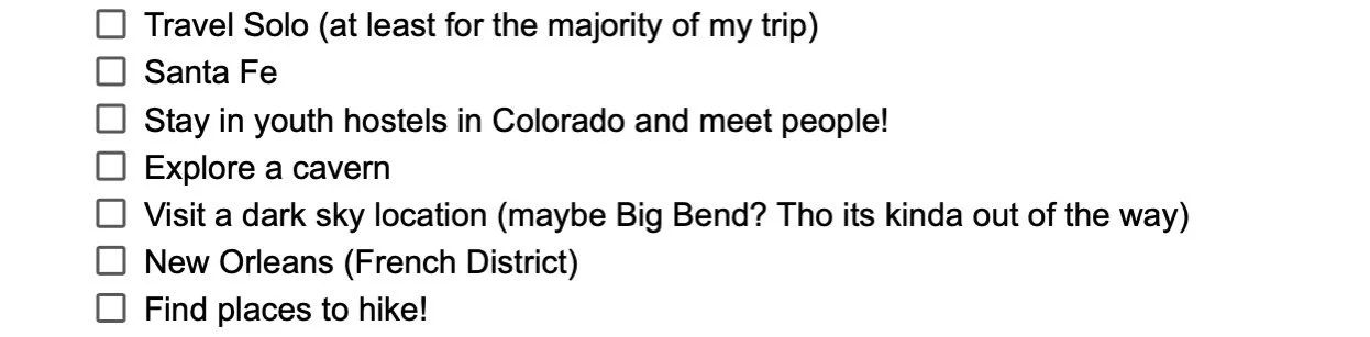 Once I embraced the fact that I wanted to travel across the United States, I had to create a plan of action. I opened a google doc and brain dumped, writing down everything I wanted to include in the trip: destinations, experiences, people, etc. For example, I decided I wanted to explore at least one cave, stay in hostels in Colorado, and visit my friends in Texas. Then, with my idealized list to reference, I shaped the skeleton of my route.