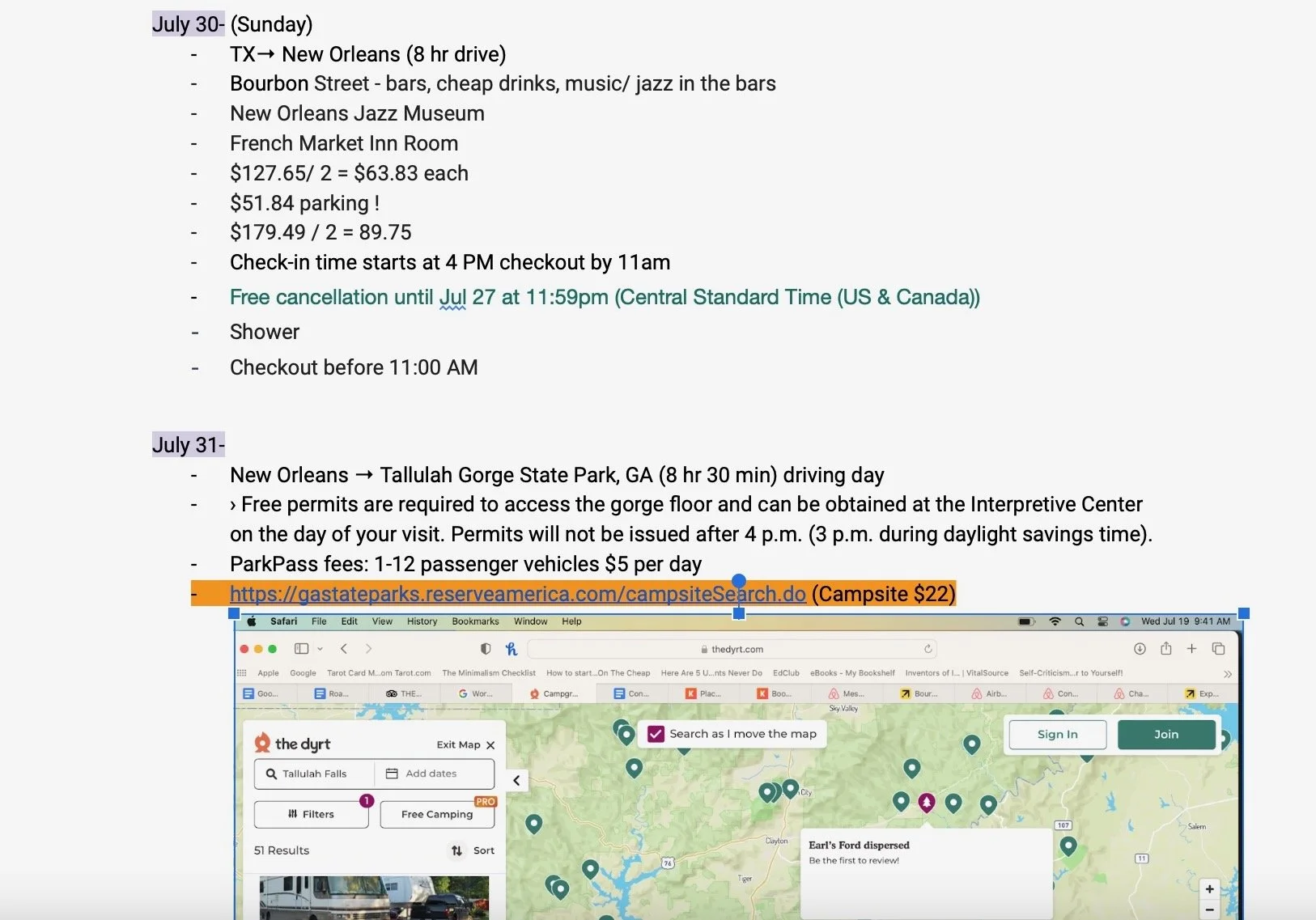 I opened another google doc and wrote out a timeline. Beginning with the day I planned to leave California, I wrote every date (e.g. July 20) and underneath, I wrote bullet points of important information about that day, including:
